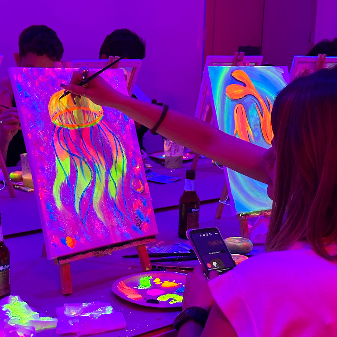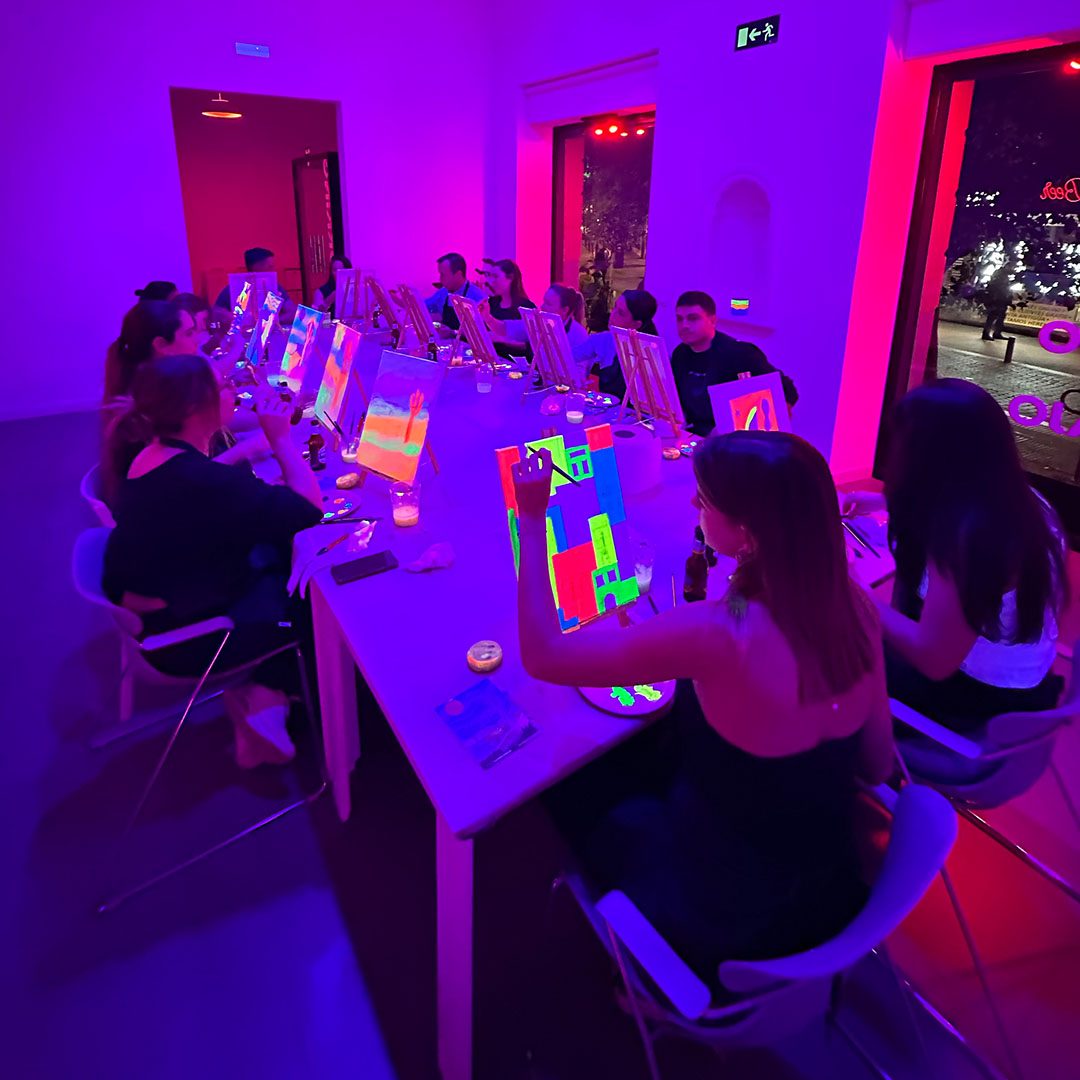 En este taller de pintura neón sobre lienzo, transformarás un lienzo en tu propia obra bajo luces ultravioleta que hacen que los colores brillen y cobren vida. No necesitas experiencia previa: nuestro equipo te guiará paso a paso para que puedas disfrutar del proceso, experimentar con los colores y crear algo único.